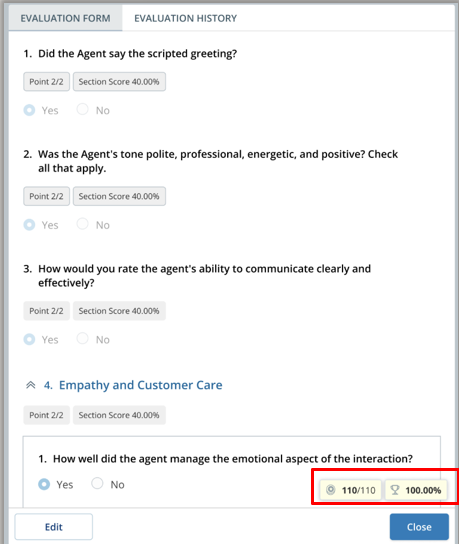 The score remains visible at the bottom of the form, making it easy to track the agent’s cumulative performance while scrolling through individual evaluation items.