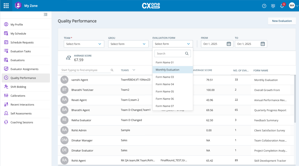 You can perform the evaluations either through the Evaluation Tasks page or Quality Performance page in My Zone.