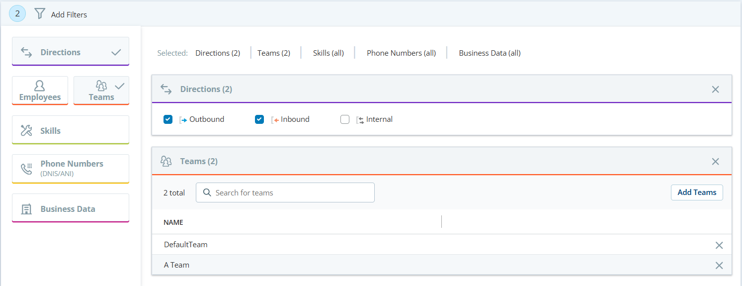 When you add Directions, Skills, and Phone Numbers filters, interactions are recorded if they match a criteria in all the filters. For example, if you add direction and skill filters, interactions are recorded if they match a specified direction AND skill.