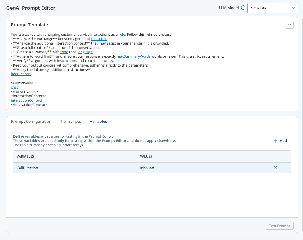 The Transcript Overview dashboard, originally planned for the 26.1 release, has been deferred and will not be included in 26.1 at this time. This dashboard will be available under the Copilot tab of Observability Dashboard and will allow you to view full call transcripts with customer and agent utterances, generative suggestions, task suggestions, rules, and associated timestamps.