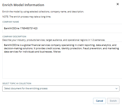 4. Complete the relevant fields. Edit the company description if required, select the appropriate collection from the Select Topic AI Collection drop-down, and click Enrich. The enrichment process uses customer interaction data from the selected collection to create an enriched model that retains the original model while adding new intents and actions.