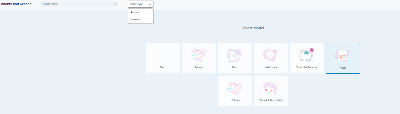 3. Use the Select type dropdown to view intents or actions for your chosen model.