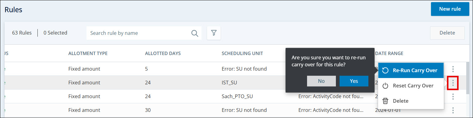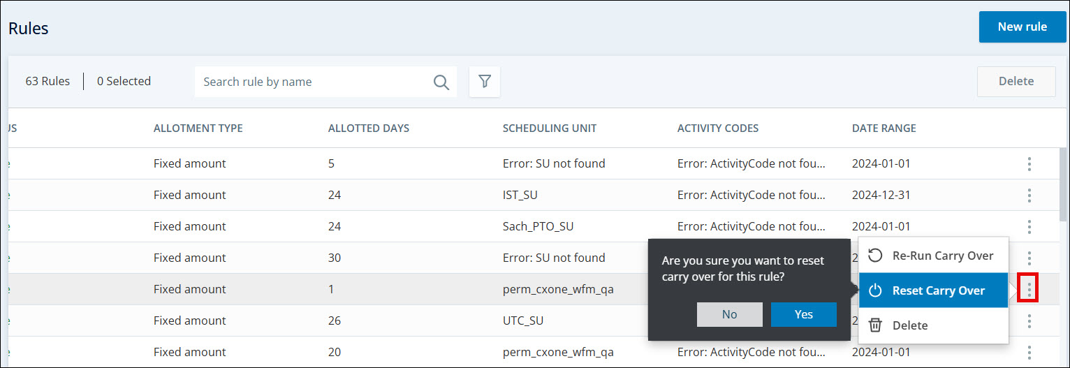 If you edit Carry Over values for a scheduling unit and activity code that are part of an active time-off rule with Allow Carry Over set to false, the changes cannot be reverted, reset, or rerun.